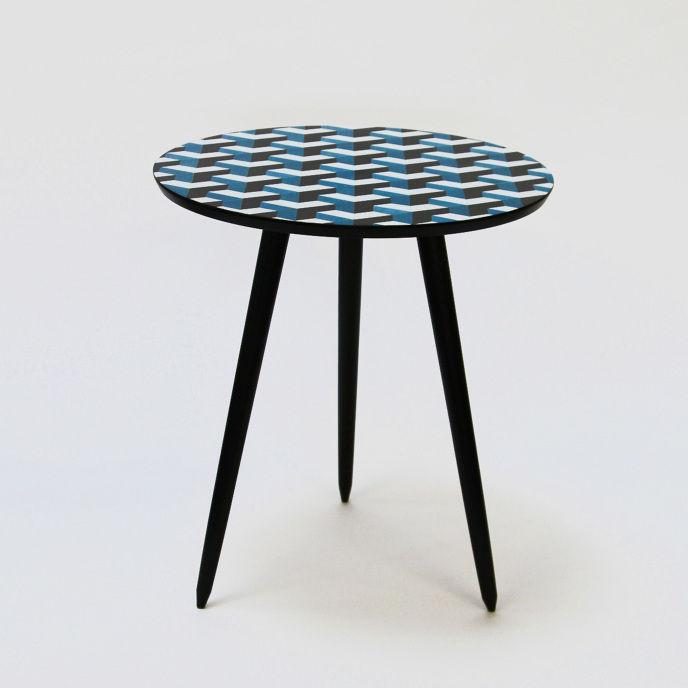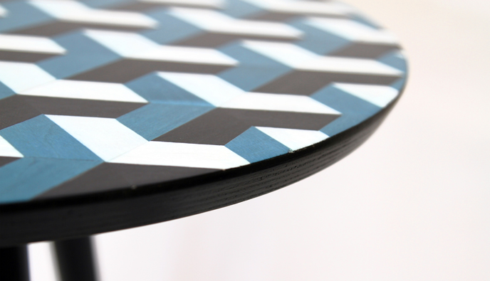 MATÉRIAUX: Bois – marqueterie « carré sur pointe (bleu, noir et blanc)